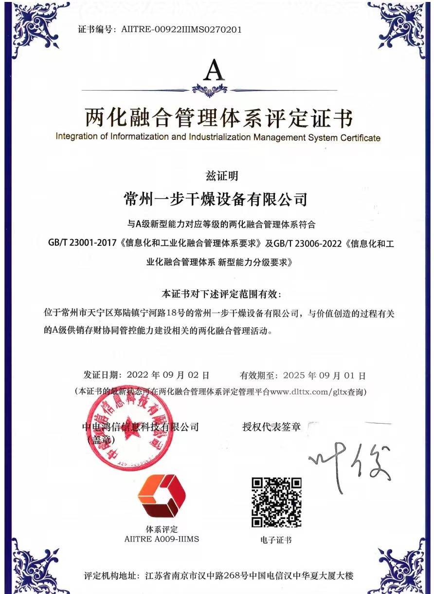 2022年9月2日,我司成功获得《两化融合管理体系评定证书》,这标志着我司在推进工业化和信息化融合方面取得了新的突破。