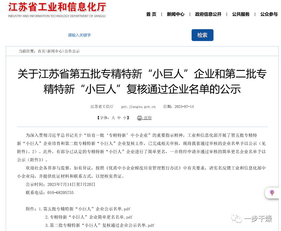 近日,工业和信息化部发布了第五批国家专精特新“小巨人”企业公示名单,常州一步干燥设备有限公司榜上有名。
