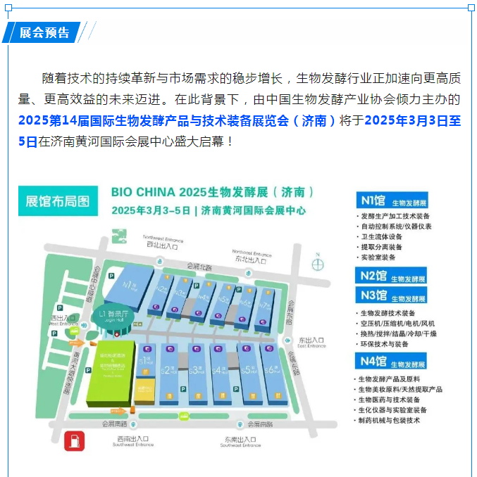 随着技术的持续革新与市场需求的稳步增长,生物发酵行业正加速向更高质量、更高效益的未来迈进。在此背景下,由中国生物发酵产业协会倾力主办的2025第14届国际生物发酵产品与技术装备展览会(济南)将于2025年3月3日至5日在济南黄河国际会展中心盛大启幕!