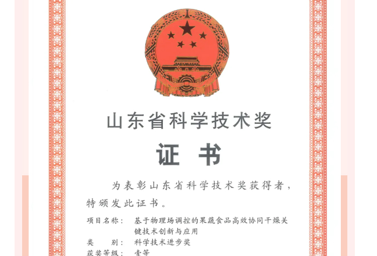 近日,中共山东省委、山东省人民政府颁发2024年度山东省科学技术奖获奖证书。常州一步干燥设备有限公司与江南大学、江苏省农业科学院等联合申报的“基于物理场调控的果蔬食品高效协同干燥关键技术创新与应用”项目斩获“一等奖”!公司总经理查文浩作为核心代表获此殊荣。这一荣誉不仅是对企业创新实力的高度认可,更是产学研深度合作结出的硕果,标志着一步干燥在食品行业果蔬干燥技术领域达到国内领先水平!