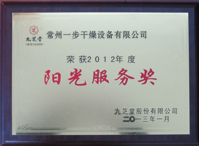 常州一步作为仅有的一家干燥设备生产商受邀参加2012年九芝堂股份有限公司供应商大会并荣获“阳光服务奖”,此殊荣的获得是九芝堂公司对我公司产品质量、售后服务的充分肯定。