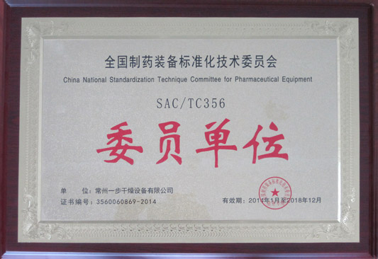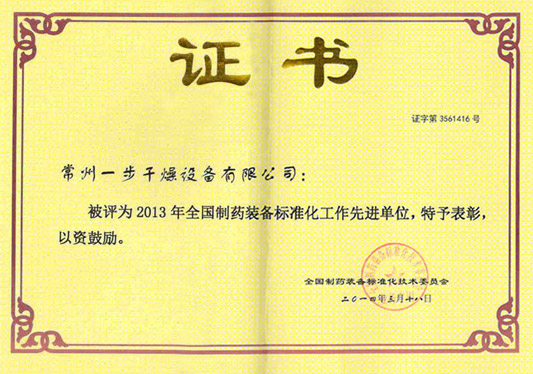 一步公司自成立以来积极参与行业标准化工作,先后承担了JB/T 20106-2007《药用V型混合机》、JB/T 20107-2007《药用卧式流化床干燥机》及JB/T 20109-2007《药用脉冲式布袋除尘器》以及JB/T 20132-2009《中药浸膏喷雾干燥器》4项行业标准起草工作计划,并均已发布实施。另外,公司还相继起草了沸腾制粒机、真空干燥机、压力式喷雾干燥机、热风循环烘箱、沸腾干燥(冷却)机五项行业标准,以及振动流化床干燥机、离心式喷雾干燥机二项行业标准的修订工作,并已发布实施。2013年在国家标准化管理委员会的批准下,一步成为中药浸膏喷雾干燥器国家标准起草单位,彰显了技术先进性,是标委会对一步公司实力的认可,也是广大客户对一步品牌的信赖和支持。
