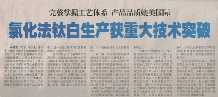 12月21日至22日,“全国首届沸腾氯化法钛白生产技术研讨会暨漯河兴茂钛业氯化法钛白工程技术评审会”在河南省漯河市金港大酒店隆重召开,来自全国钛白行业的^云集漯河,对漯河兴茂钛业股份有限公司沸腾氯化法钛白工艺的相关生产技术工艺进行了研讨、评审,然后形成了^评审意见。评审^指出,漯河兴茂钛业沸腾氯化法钛白工艺依据其设计、运行效果和产品质量的综合评价,已完整地掌握了氯化法钛白粉生产工艺技术体系,拥有独立的自主知识产权。