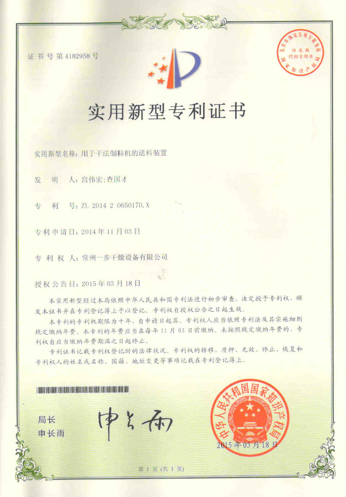 干法制粒机关键部件挤压装置、送料装置的创新技术得到了国家知识产权局的授权,喜获二项专利,专利号分别为:ZL201420673874.9、ZL201420650170.X。