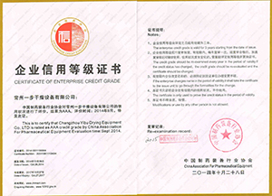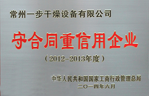 一步干燥在查国才董事长的带领下,一直以“约守信诚,铸就品牌,高质量服务,赢得市场”为企业宗旨,公司先后被授予“国家高新技术企业”、“国家守合同重信用企业”、“江苏省AAA级重合同守信用企业”、“江苏省质量诚信五星级企业”,还通过了制药装备行业信用评价体系,并被为“AAA”,等多项荣誉。长期以来,公司始终坚持诚信经营,共同发展的信誉理念,树立“一步”品牌,提高在国内外的知名度。