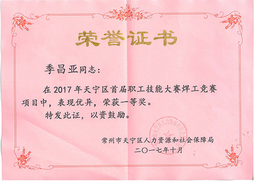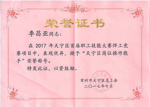 我公司一线技术能手踊跃报名参加竞赛,并且不负众望,在60多名参赛选手中脱颖而出,其中季昌亚荣同志荣获“2017天宁区首届职工技能大赛焊工竞赛项目”一等奖,被授予“天宁区岗位操作能手”荣誉称号,金锡松同志和陈志伟同志分别荣获优胜奖,展现了一步职工过硬的专业技能水平和精彩的竞技风采。
