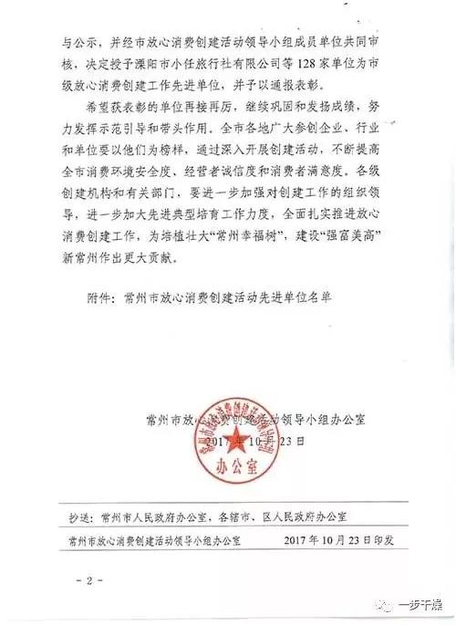 近日,常州市放心消费创建活动办公室对2017年度常州市放心消费创建工作中,效果明显、成绩突出的先进单位进行了通报表彰,常州一步榜上有名。