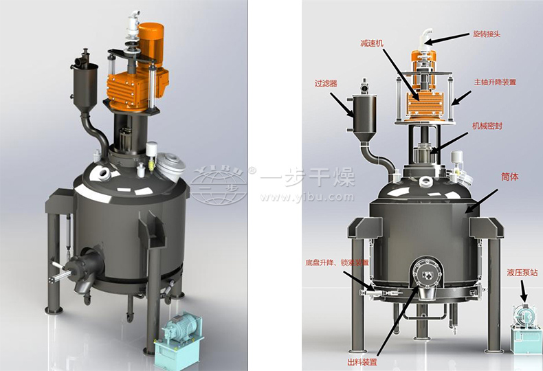 三合一设备的干燥工艺可以采用真空干燥。影响真空干燥工艺的因素主要是真空度、干燥时间、搅拌桨特性等。真空干燥过程是采用真空系统将罐内的惰性气体抽走,使气体分子数减少,隔绝空气,主要适合于易氧化变质的物料,也适合于蒸发需要回收溶剂的物料、热敏性物料。真空状态下,可以减少物料染菌的机会,或者抑制某些细菌的生长,因此特别适合于无菌物料的干燥。