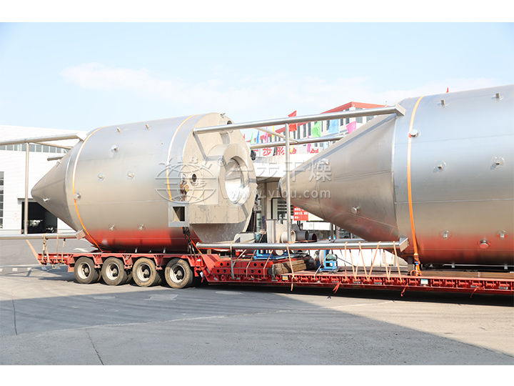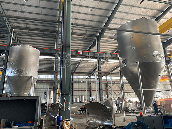 YPG系列压力式喷雾(冷却)干燥机是将料液压入位于塔体顶部的喷嘴雾化成微小雾滴,同塔顶热风平行而下完成干燥。该机具有收尘率高,无粘壁、节能高效等特点,特别适用于热敏性物料干燥。广泛应用于食品染料、中间体等行业。