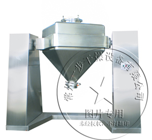 •将物料装入方锥形密闭混合桶内,料斗对称的轴线与回转轴轴线成一夹角,不同成份物料在密闭的料门中进行三维空间运动,产生强烈翻转和扩散作用,达到好的混合效果。整机设计新颖、结构紧凑、外形美观、混合均匀度达99%,体积装料系数达0.8。